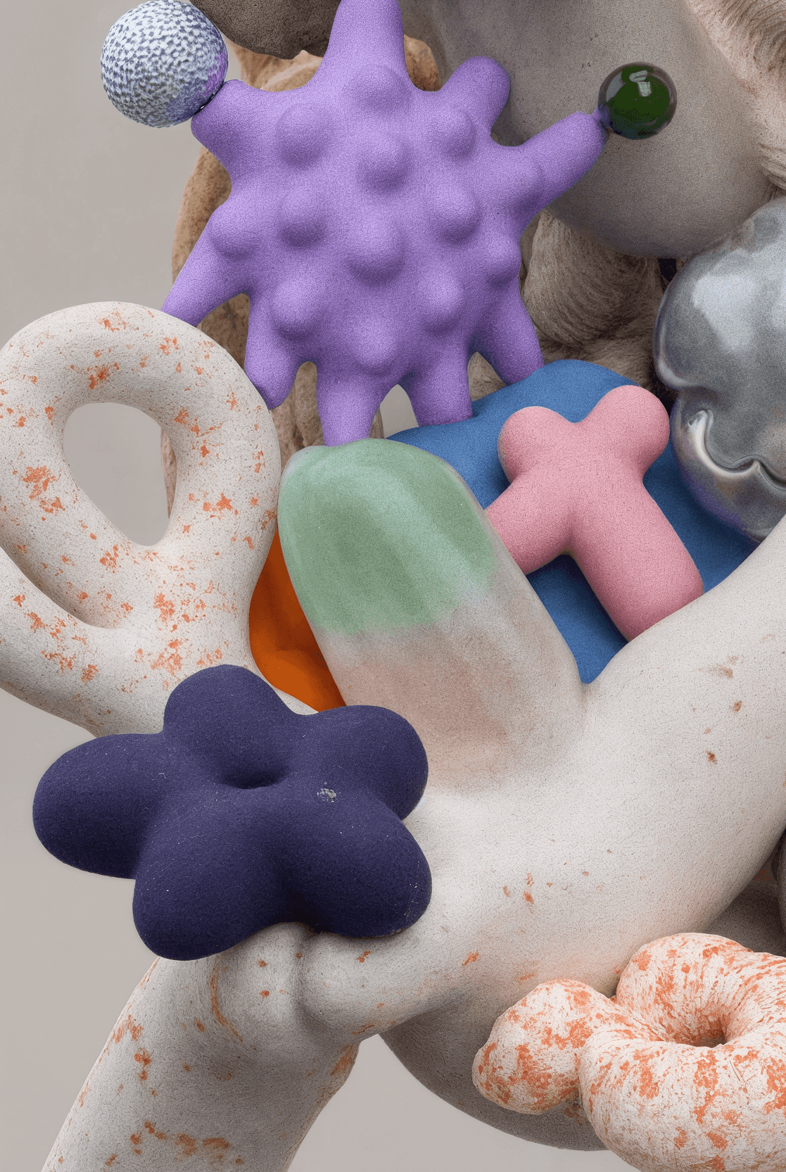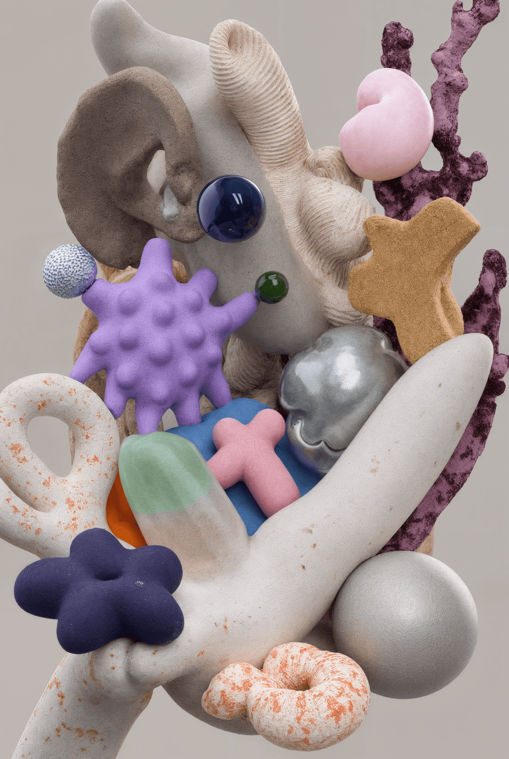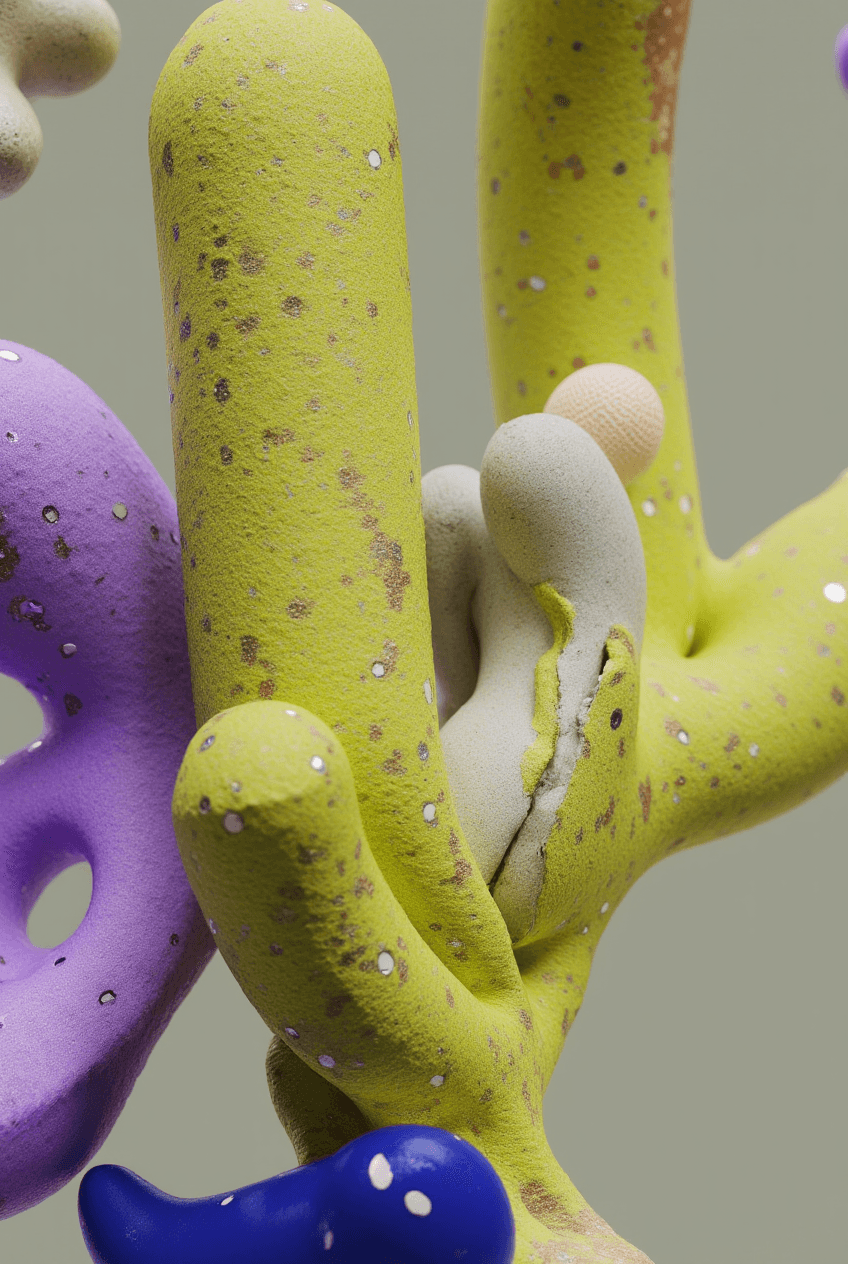 I joined together forms that suggest fruit, organs, coral, and fungi, letting them grow into a loop that feels whole yet slightly off balance. It looks like an unfamiliar creature, or a cluster of body fragments still in the middle of changing. The colors are soft, while the surface stays a little raw. That contrast gives the piece both intimacy and a quiet sense of unease. I wanted to hold onto that feeling between tenderness, fragility, and strangeness.