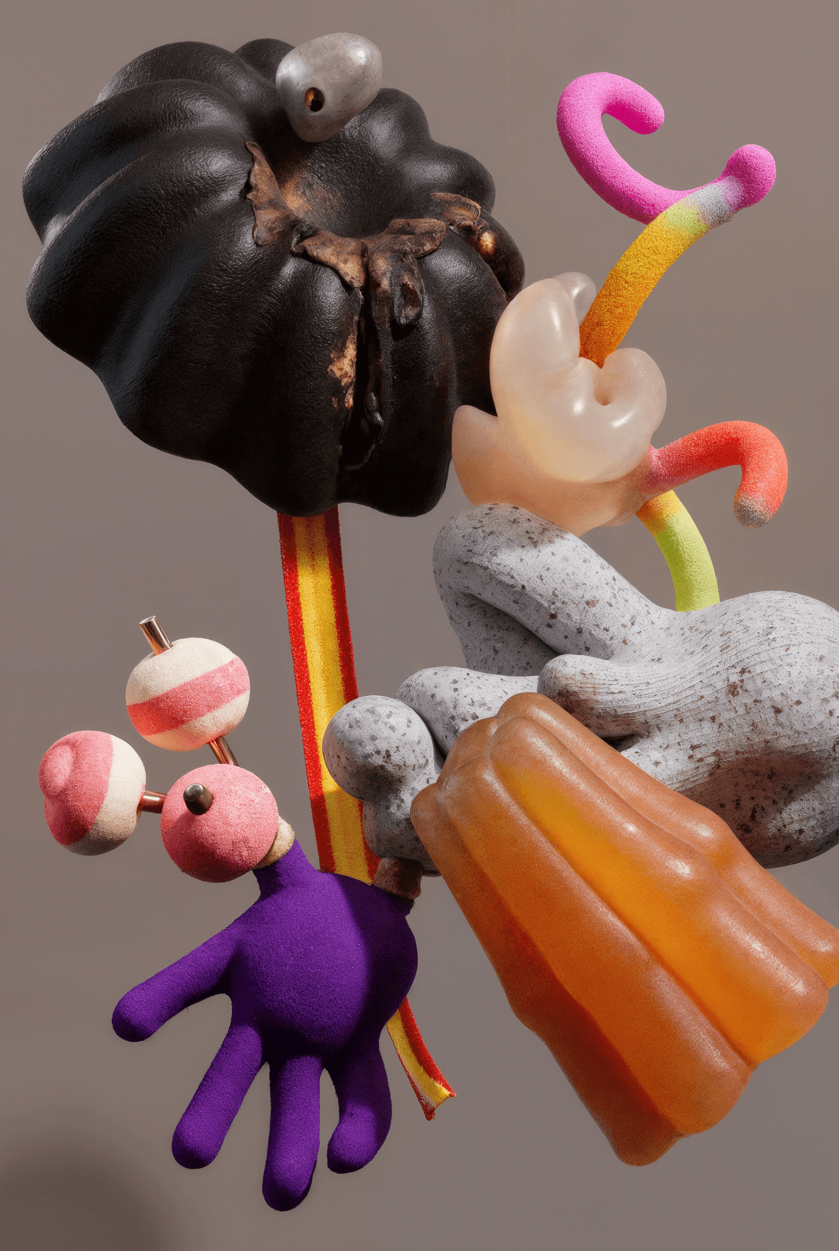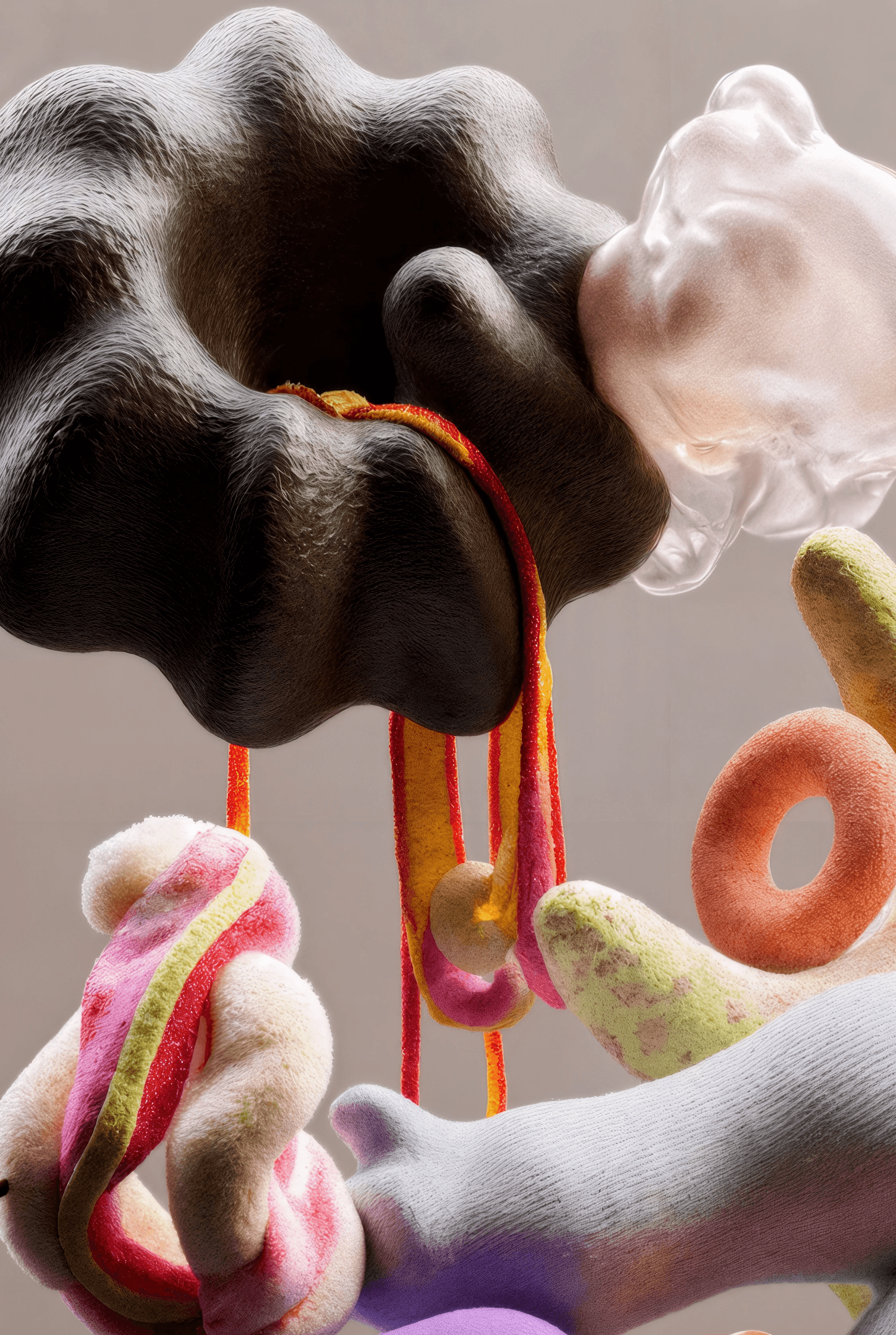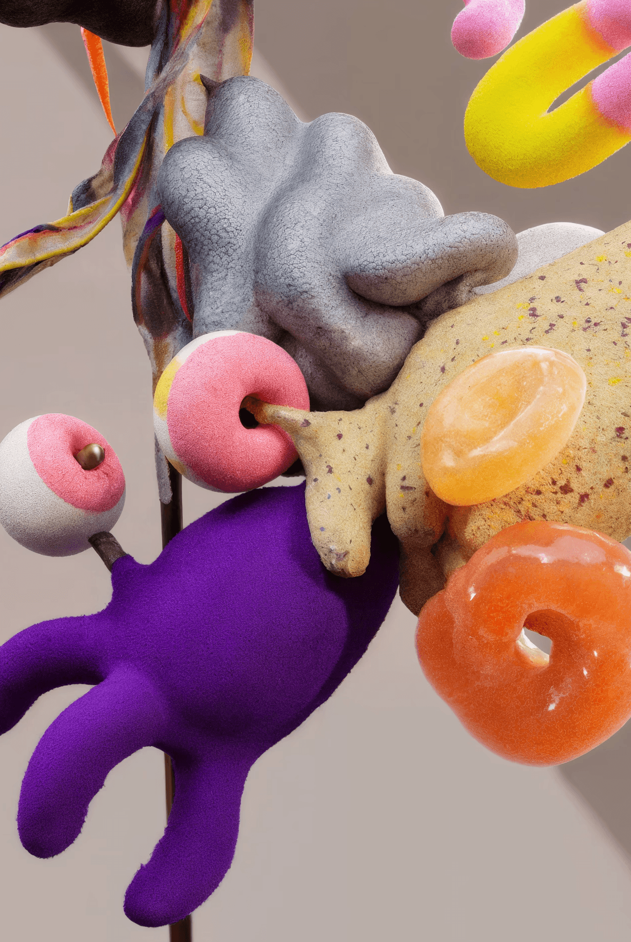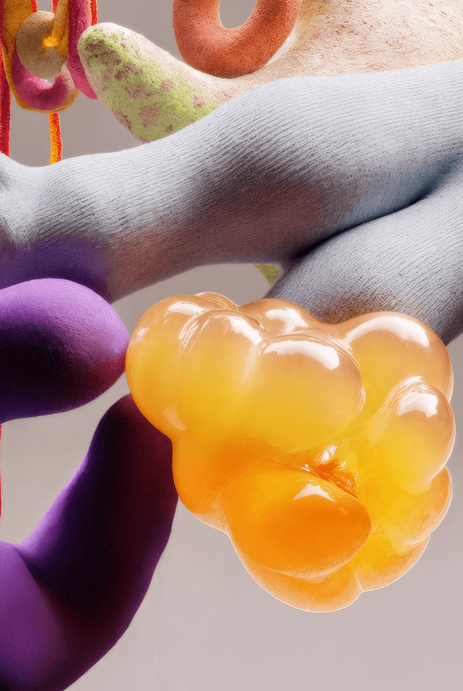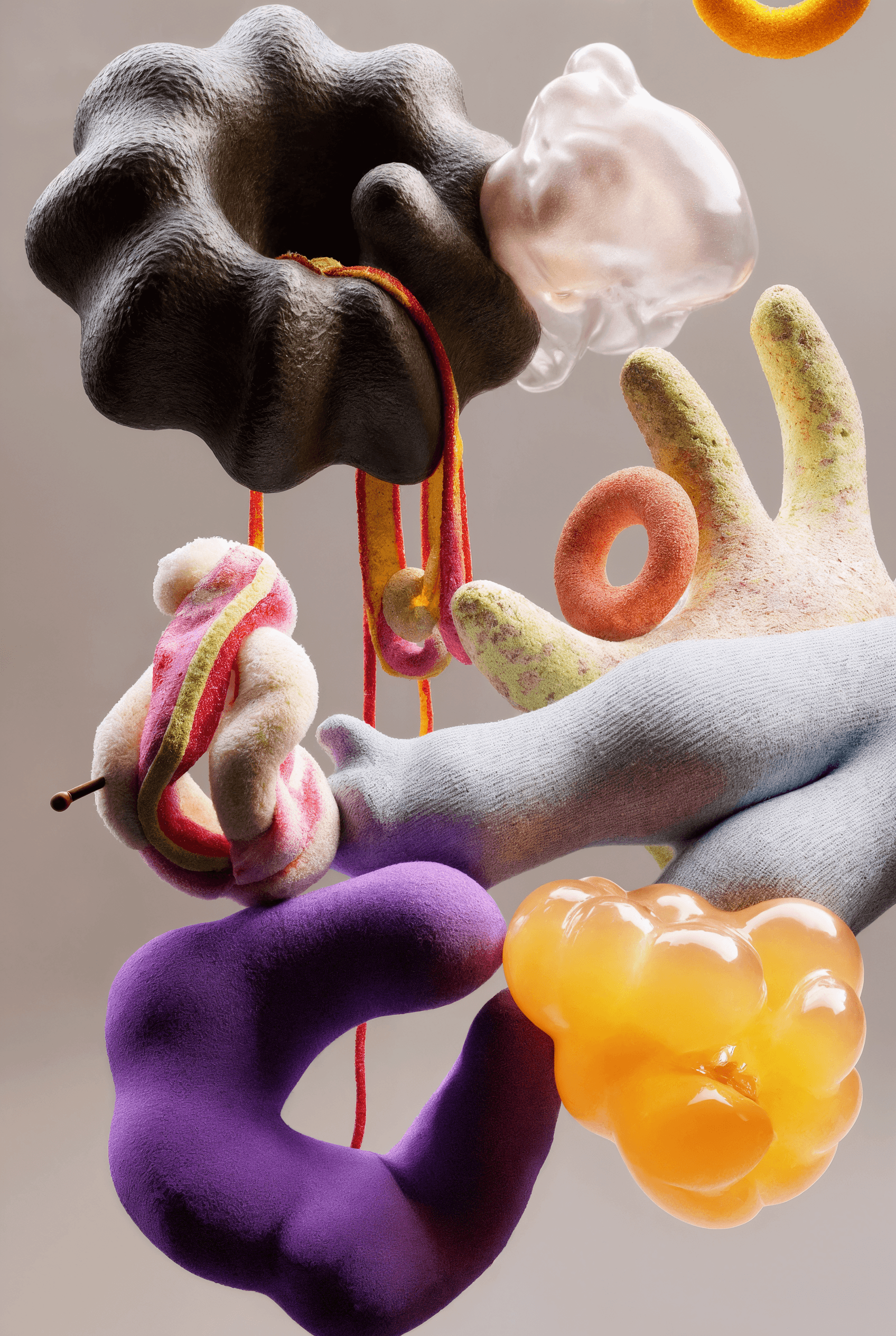 I joined together forms that suggest fruit, organs, coral, and fungi, letting them grow into a loop that feels whole yet slightly off balance. It looks like an unfamiliar creature, or a cluster of body fragments still in the middle of changing. The colors are soft, while the surface stays a little raw. That contrast gives the piece both intimacy and a quiet sense of unease. I wanted to hold onto that feeling between tenderness, fragility, and strangeness.