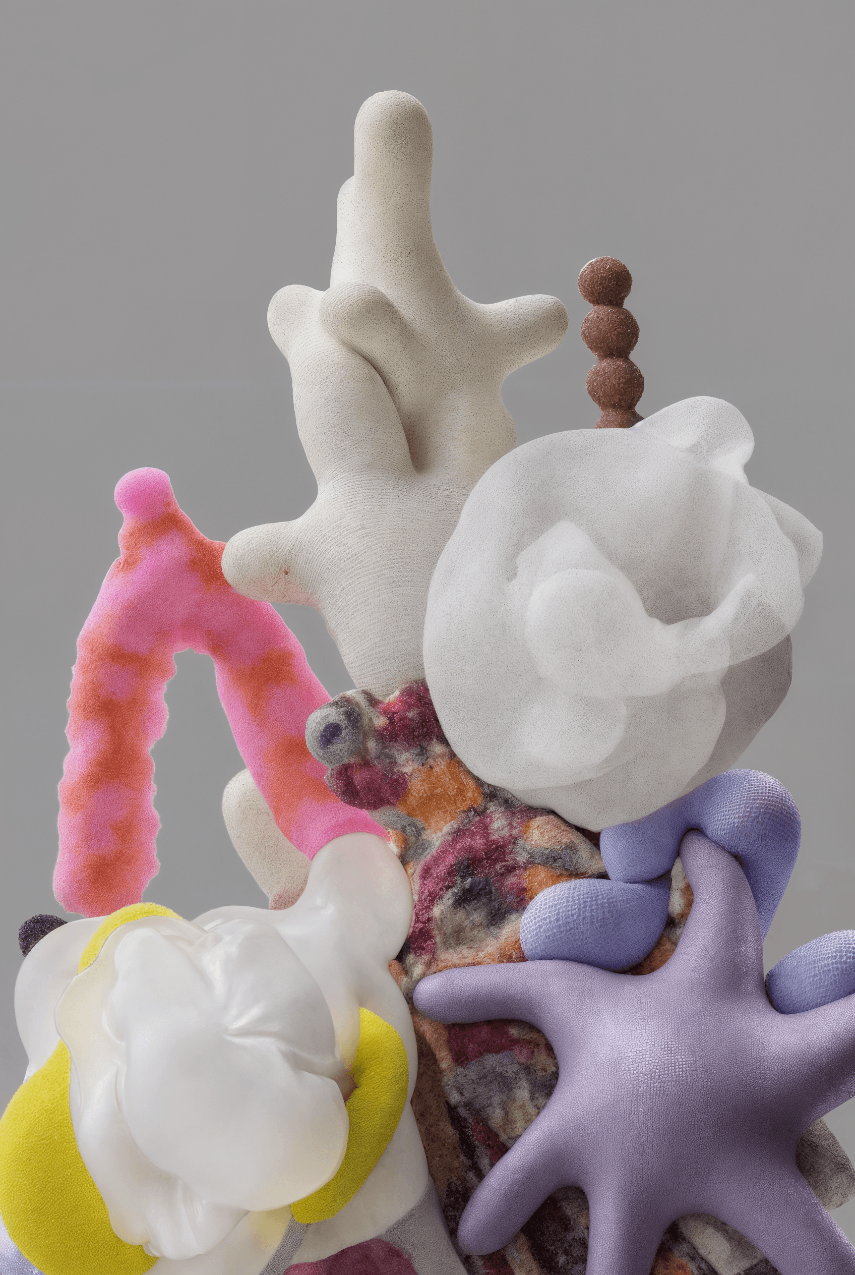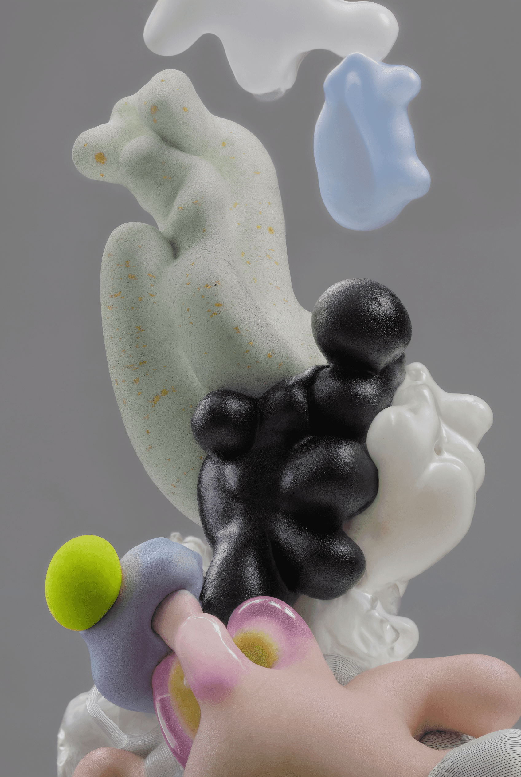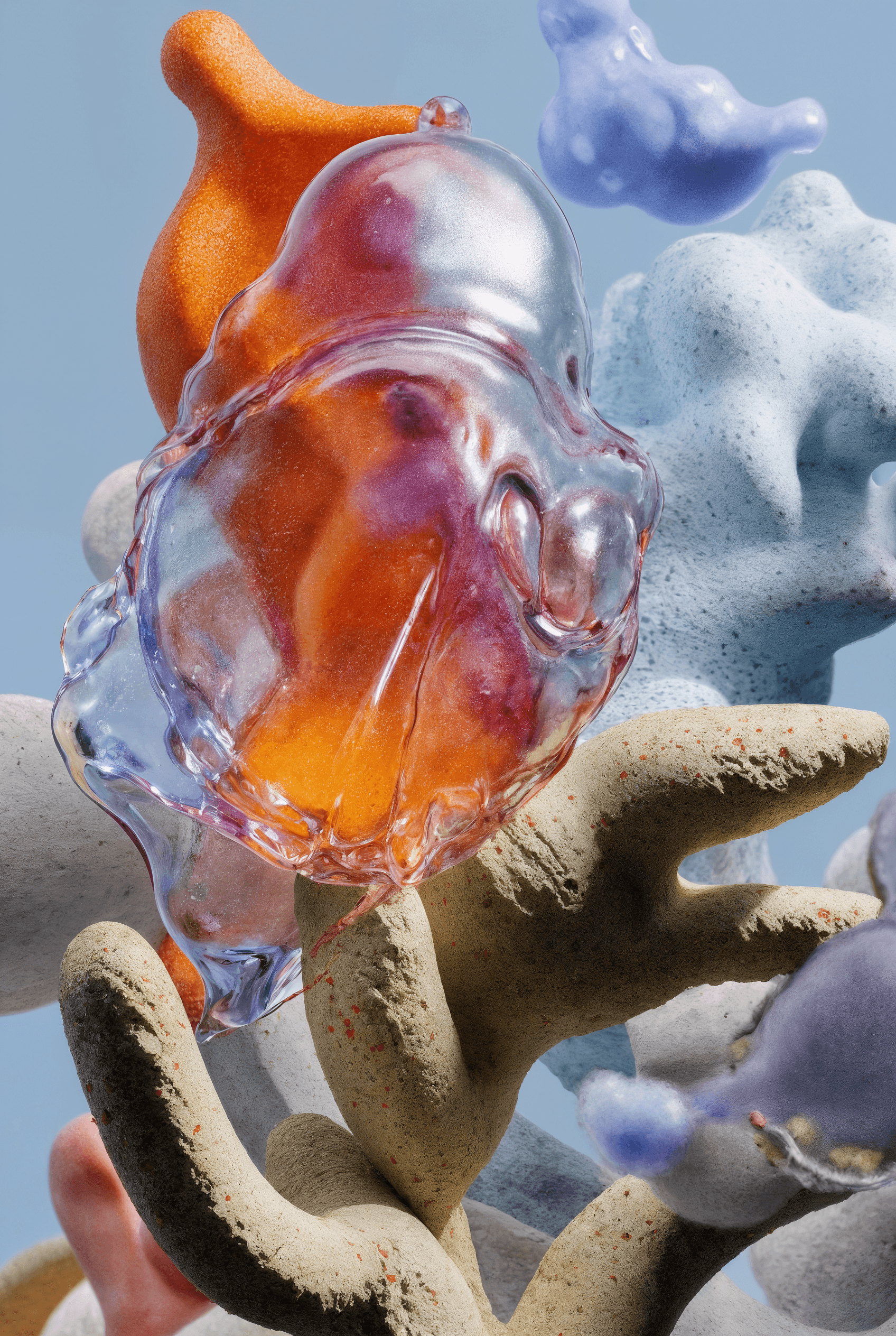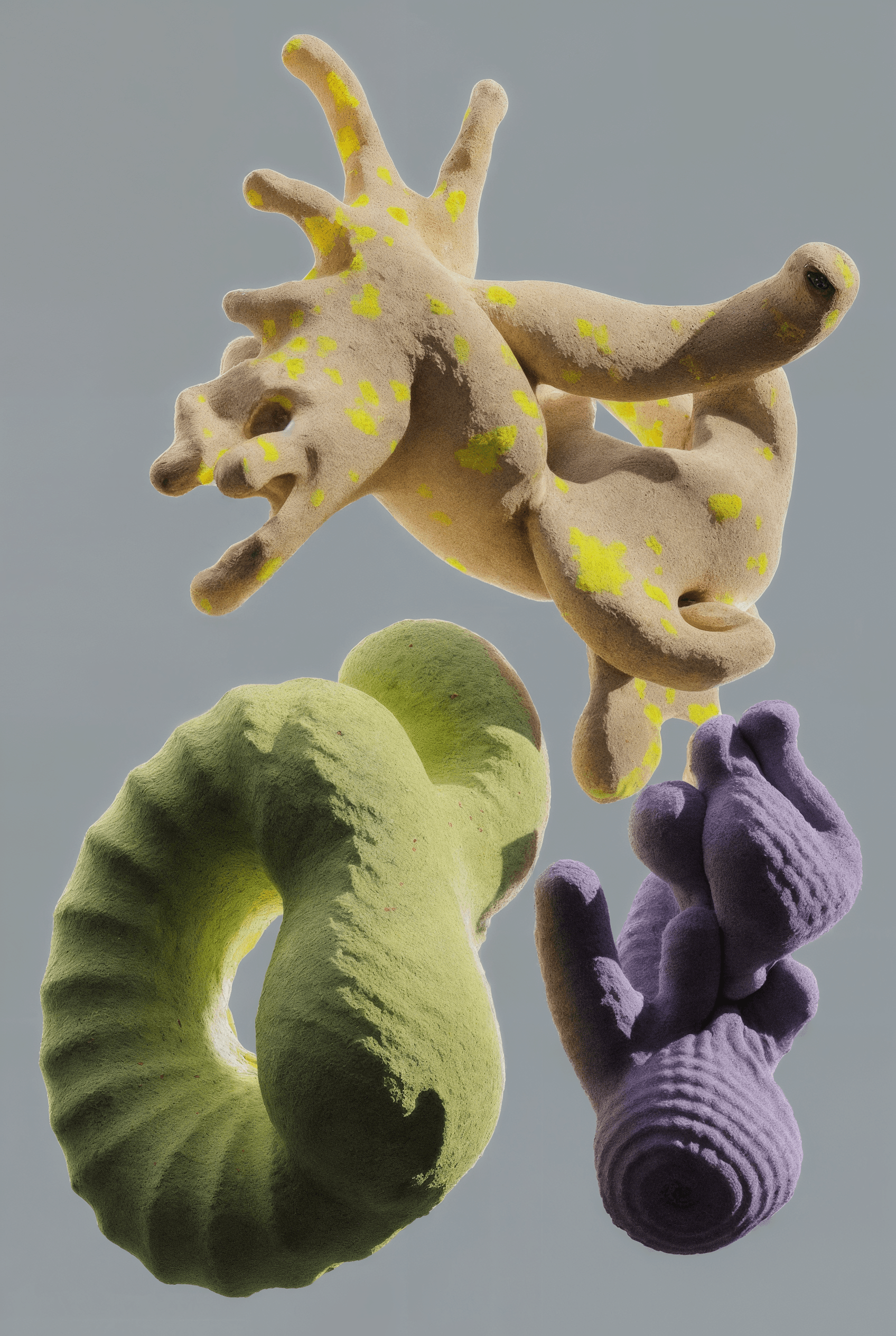 I joined together forms that suggest fruit, organs, coral, and fungi, letting them grow into a loop that feels whole yet slightly off balance. It looks like an unfamiliar creature, or a cluster of body fragments still in the middle of changing. The colors are soft, while the surface stays a little raw. That contrast gives the piece both intimacy and a quiet sense of unease. I wanted to hold onto that feeling between tenderness, fragility, and strangeness.