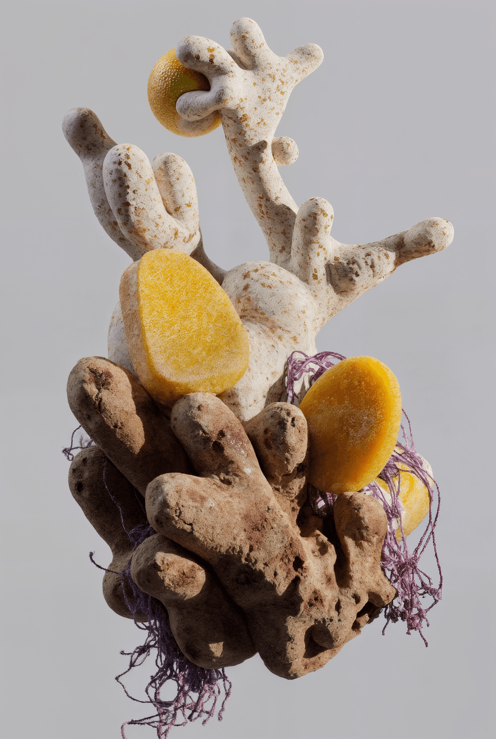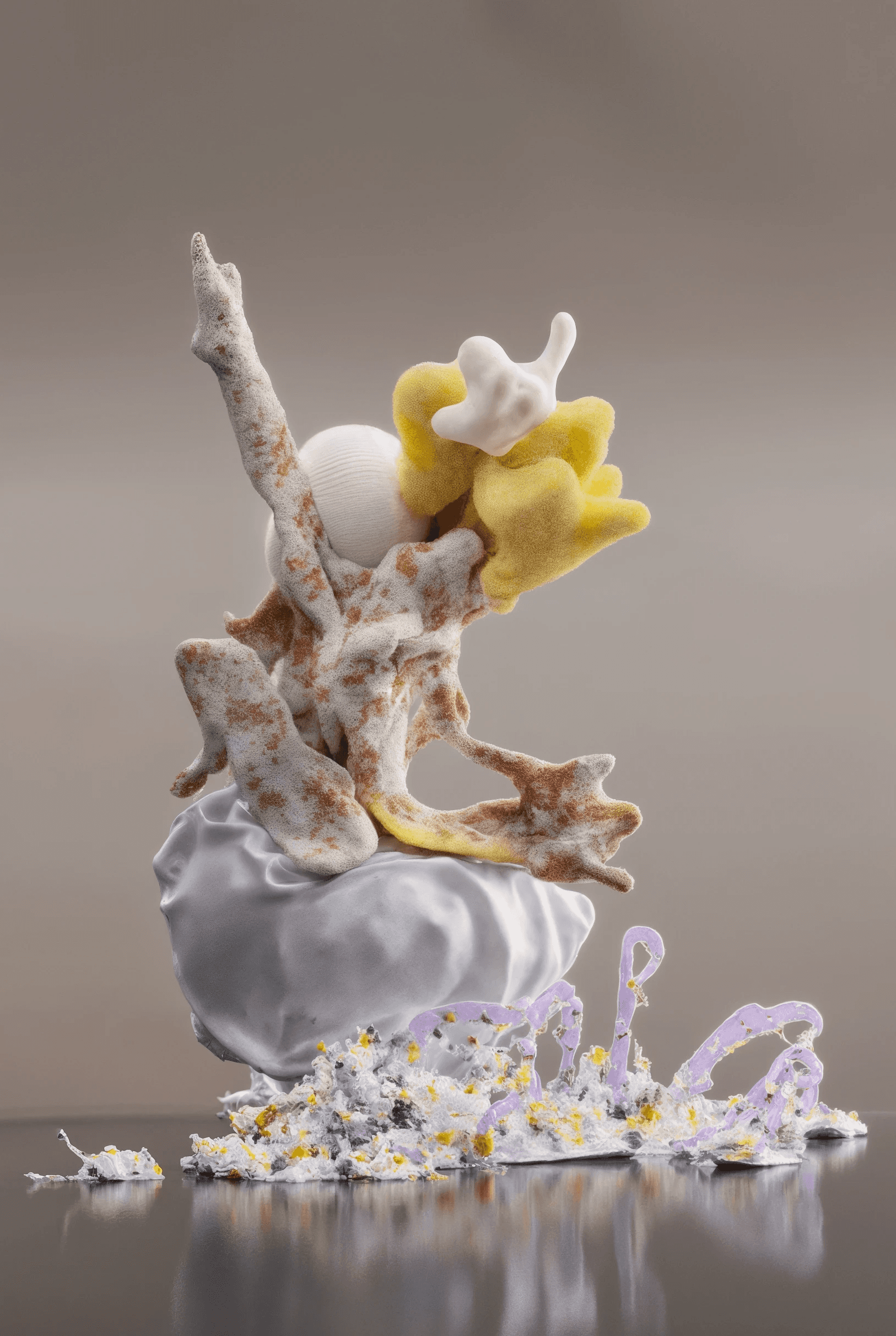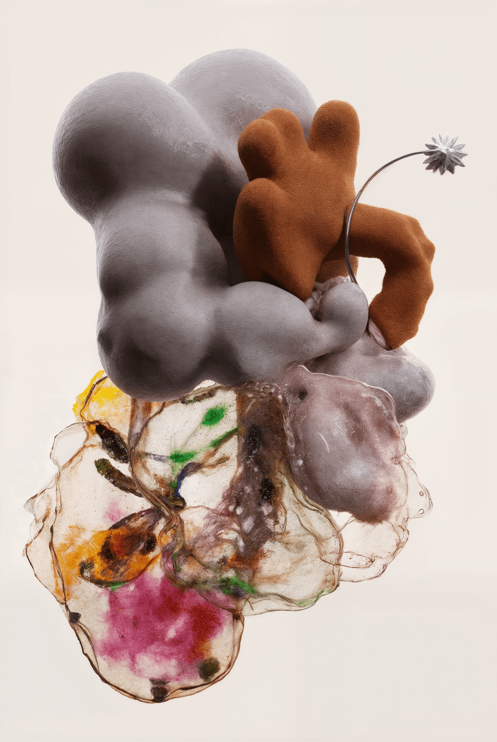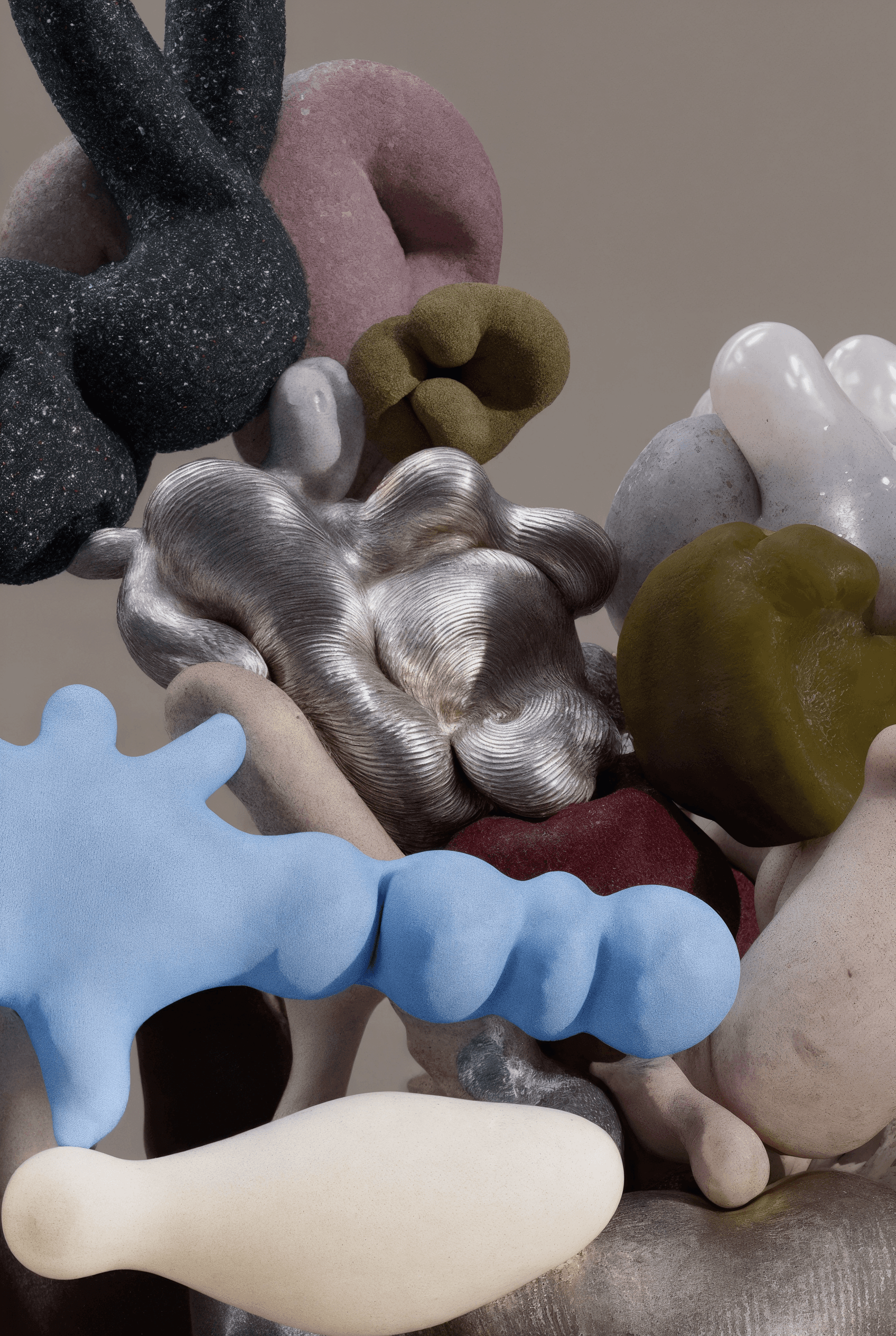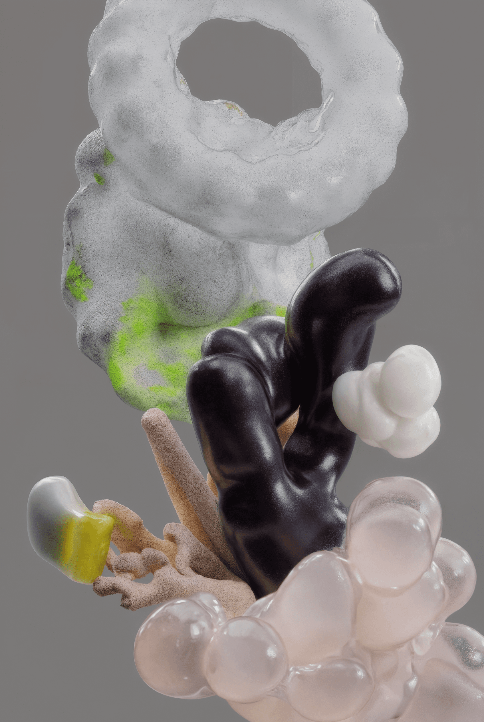I joined together forms that suggest fruit, organs, coral, and fungi, letting them grow into a loop that feels whole yet slightly off balance. It looks like an unfamiliar creature, or a cluster of body fragments still in the middle of changing. The colors are soft, while the surface stays a little raw. That contrast gives the piece both intimacy and a quiet sense of unease. I wanted to hold onto that feeling between tenderness, fragility, and strangeness.