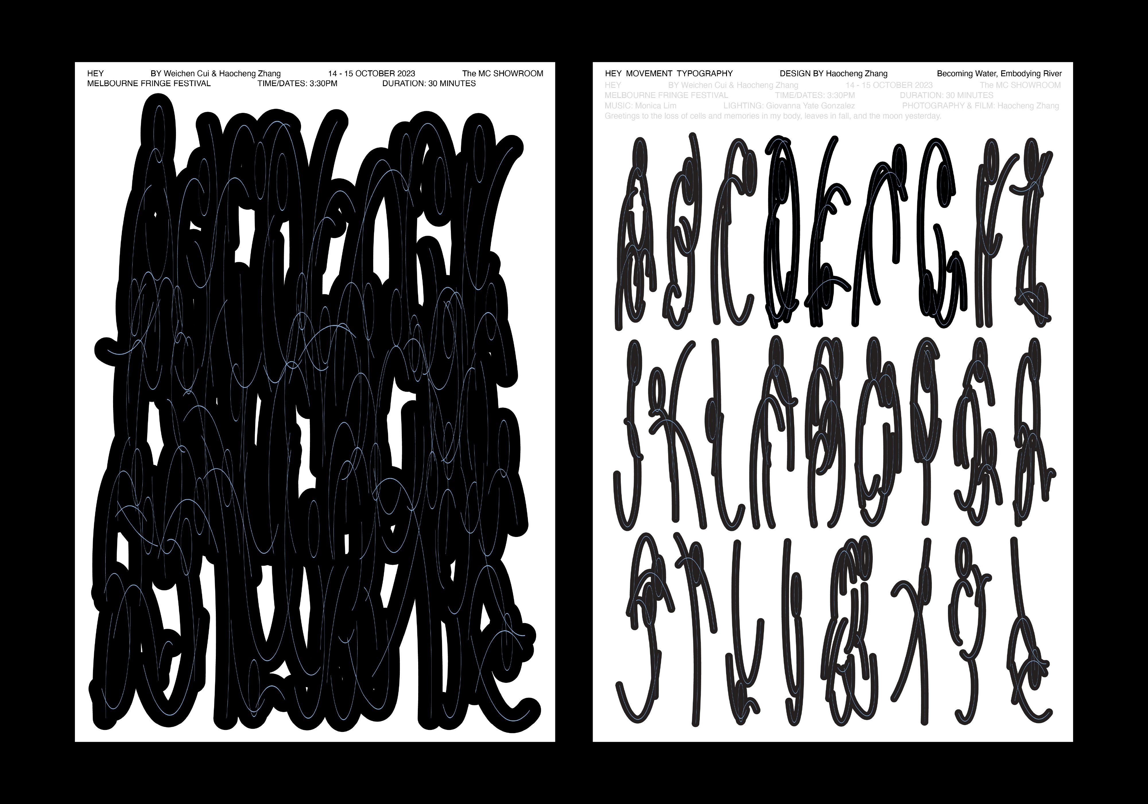 The HEY Movement Typography is an experimental typeface created through choreography and embodied drawing, transforming body movements into expressive letterforms. Inspired by themes of water, transformation, and cultural identity, the typeface captures the rhythm and flow of a live performance. It was featured in the poster design for the Melbourne Fringe Festival show HEY, visually echoing the performance’s emotional depth. With three distinct weights—Regular, Light, and Thin, this project bridges choreography and graphic design, offering a poetic and cross-disciplinary approach to storytelling through typography.
