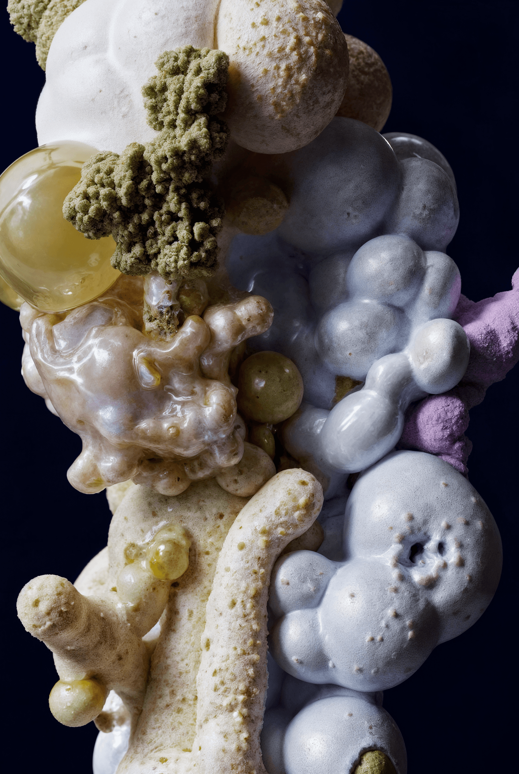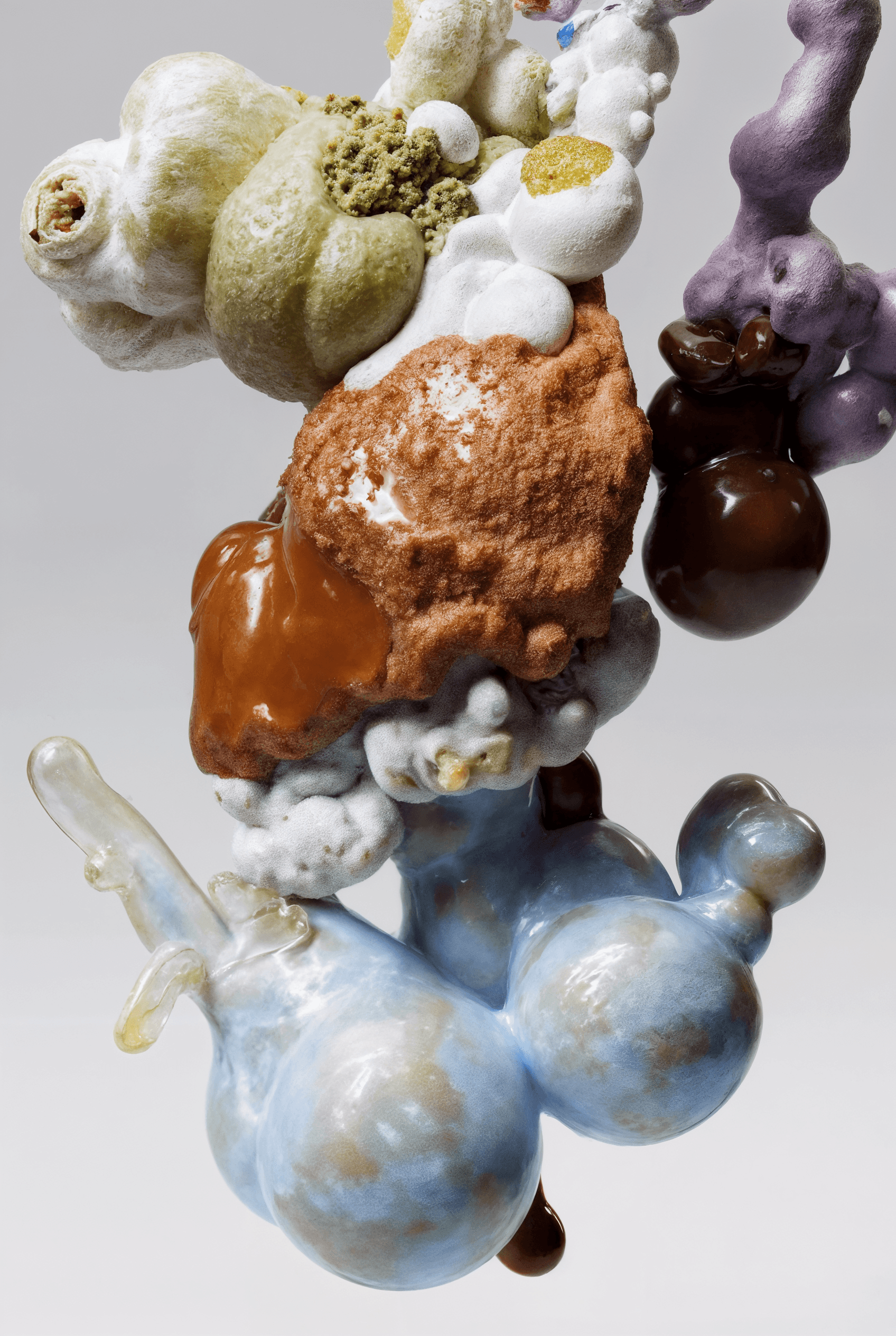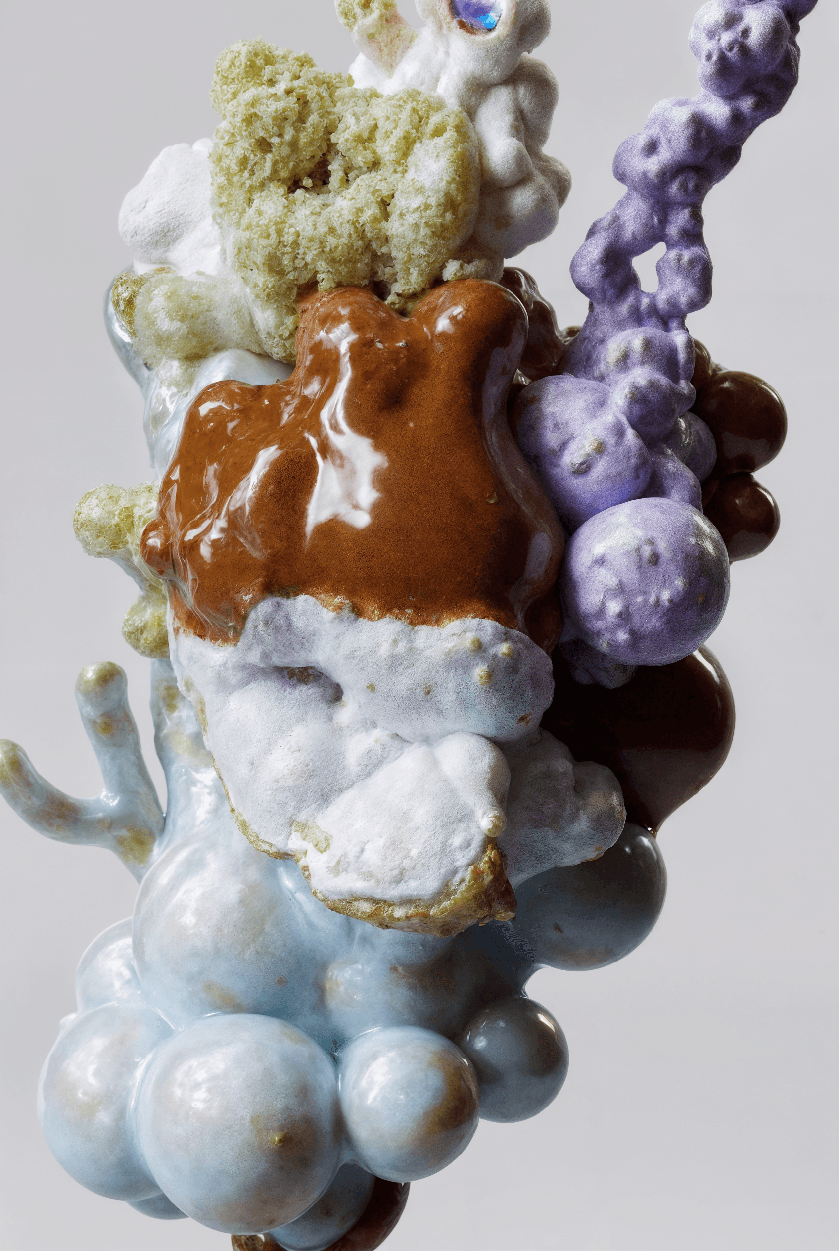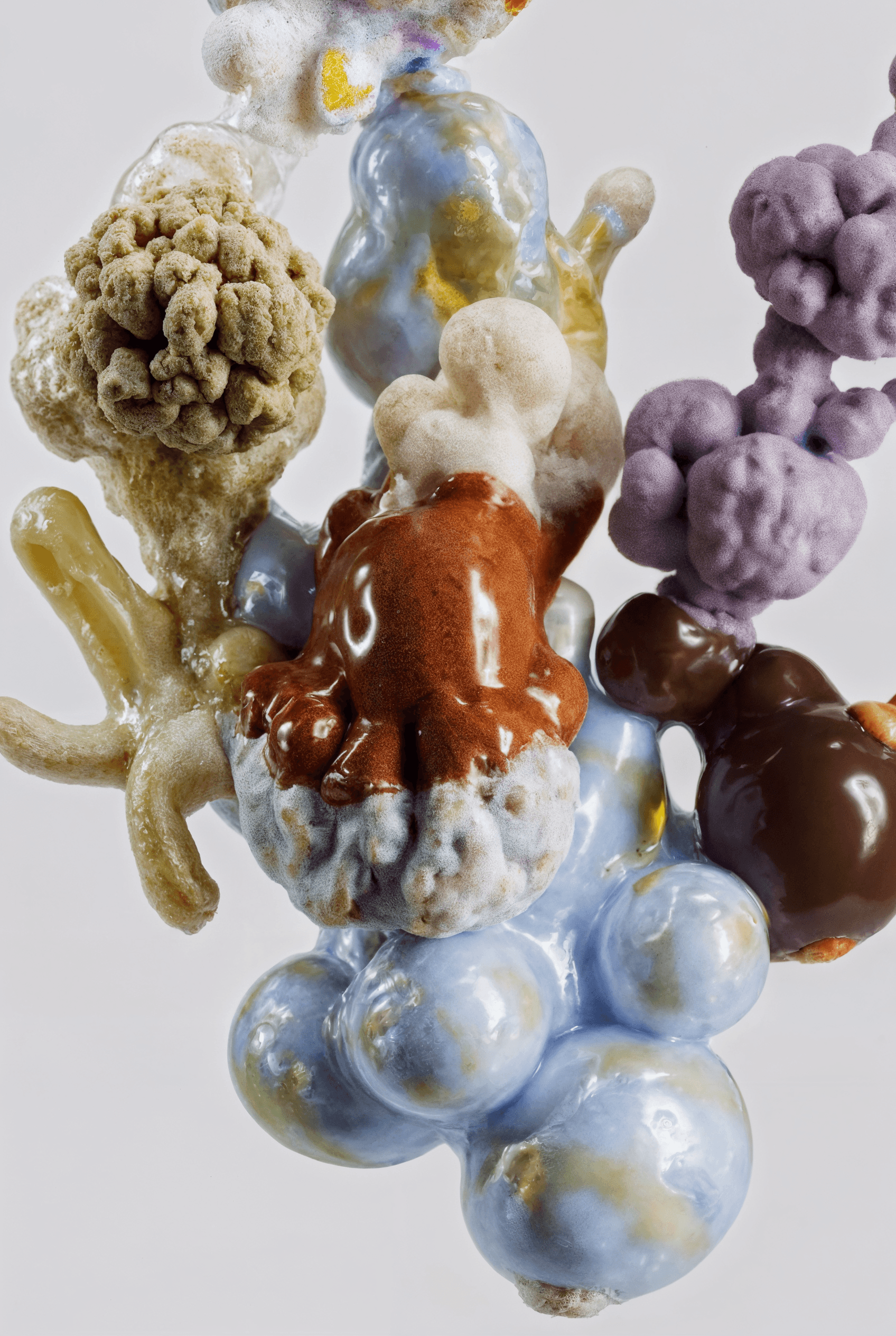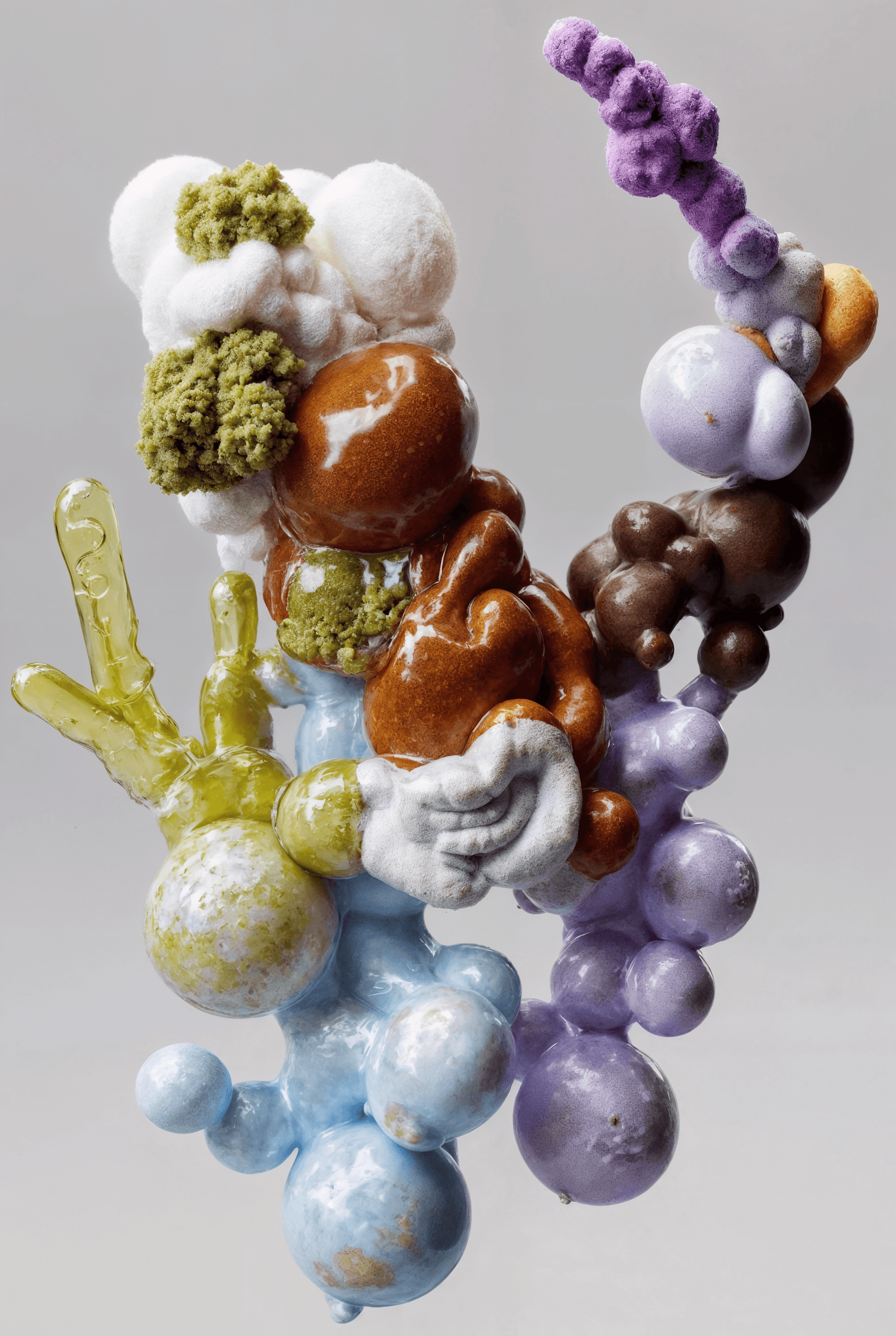 I joined together forms that suggest fruit, organs, coral, and fungi, letting them grow into a loop that feels whole yet slightly off balance. It looks like an unfamiliar creature, or a cluster of body fragments still in the middle of changing. The colors are soft, while the surface stays a little raw. That contrast gives the piece both intimacy and a quiet sense of unease. I wanted to hold onto that feeling between tenderness, fragility, and strangeness.