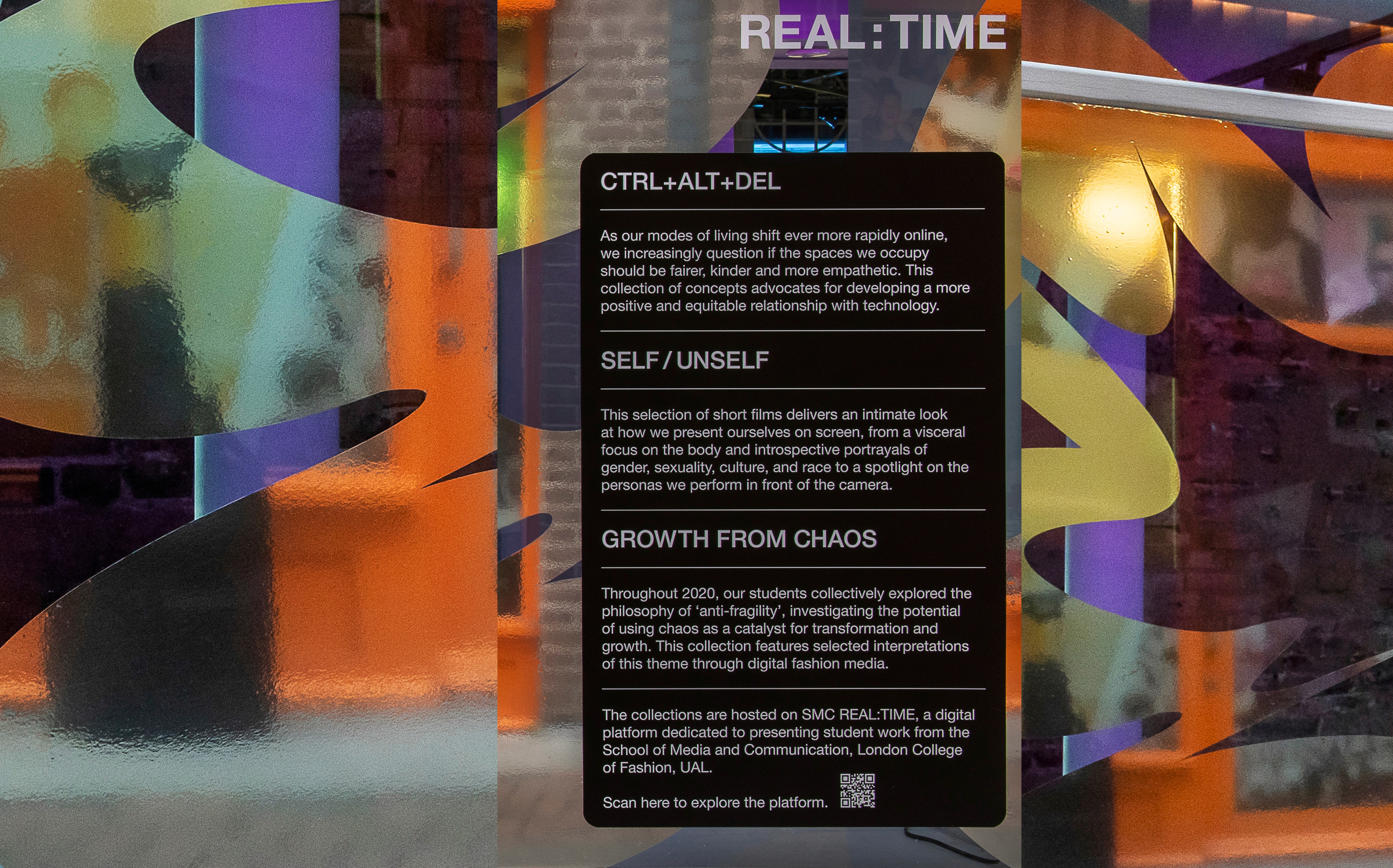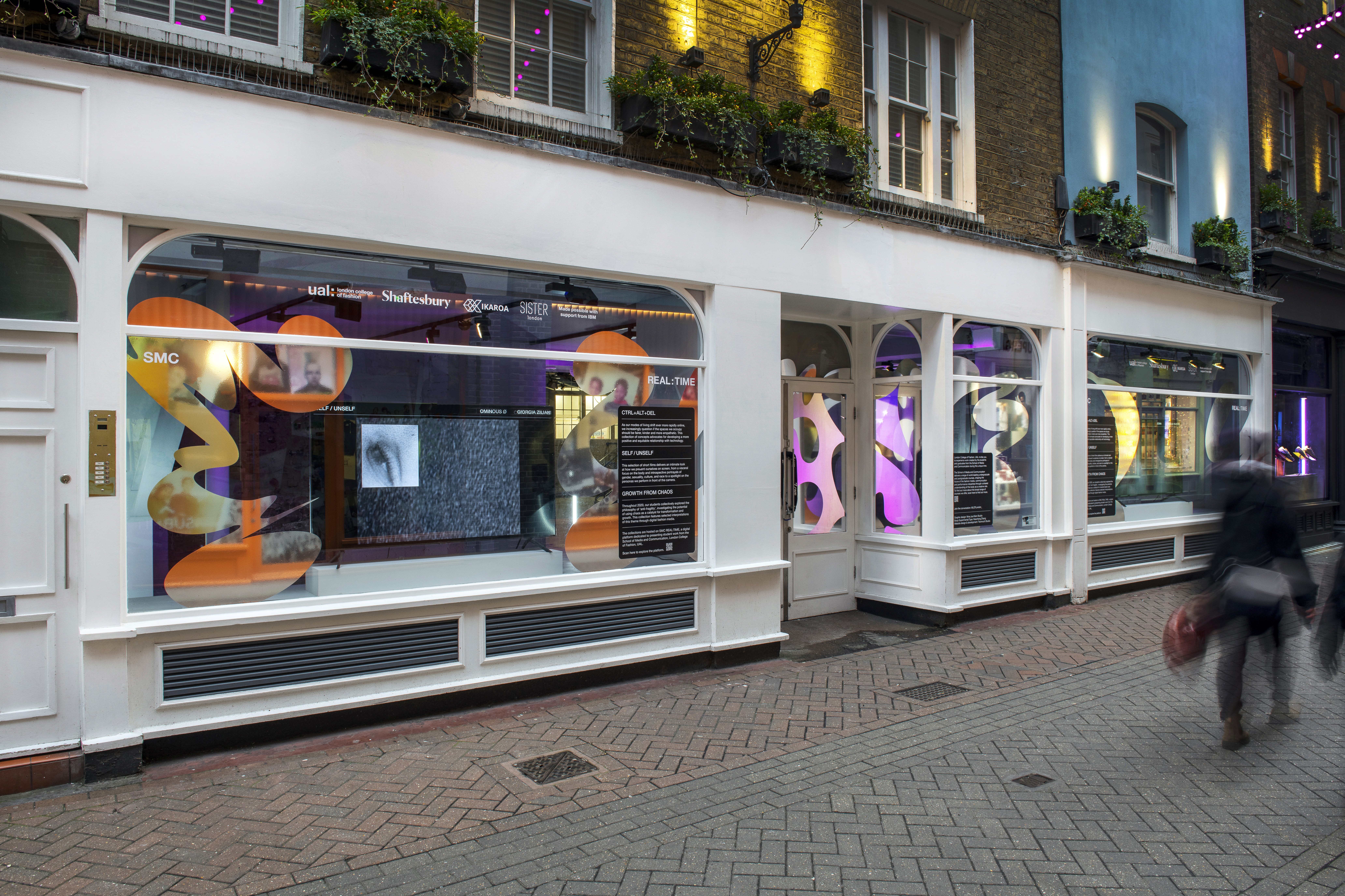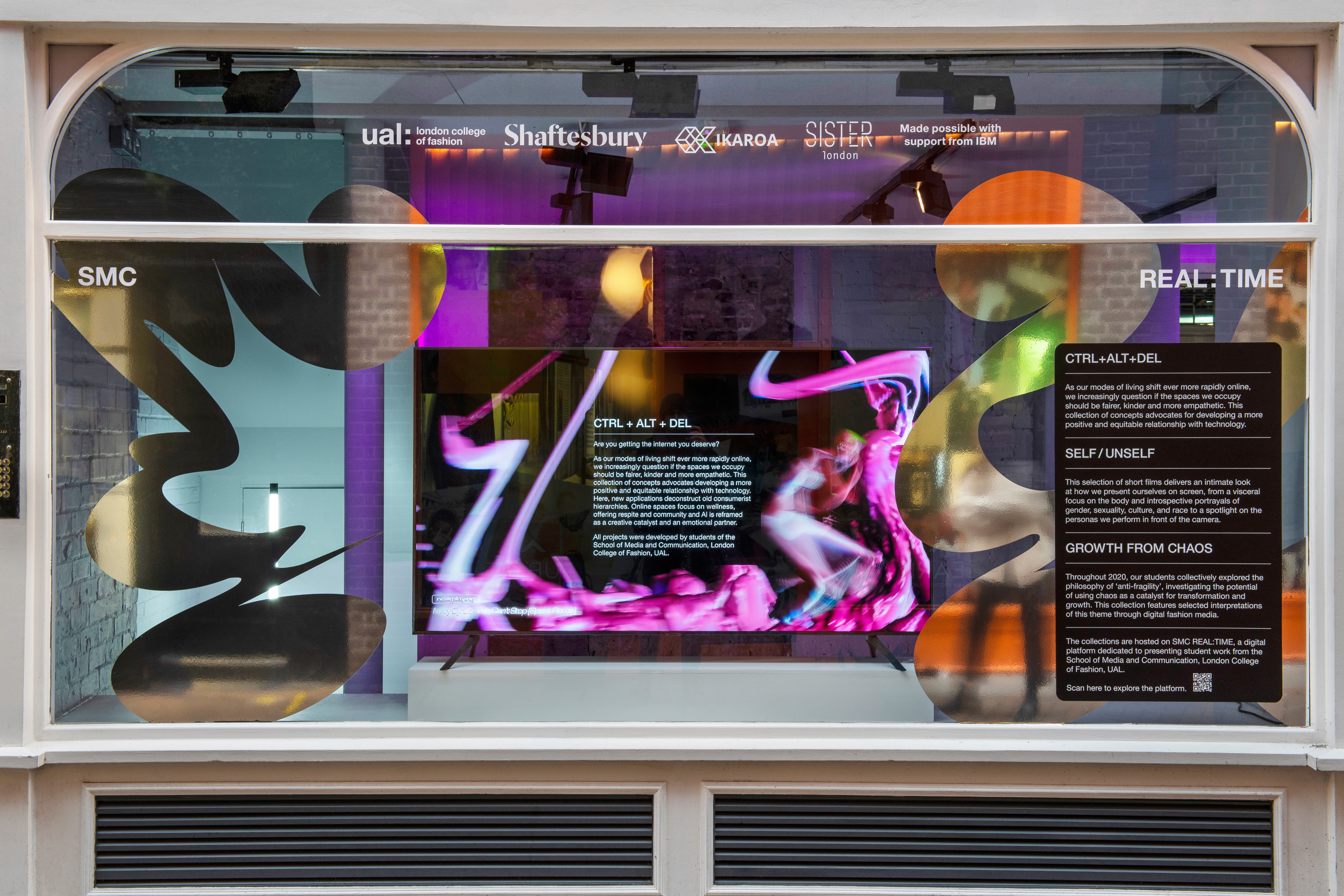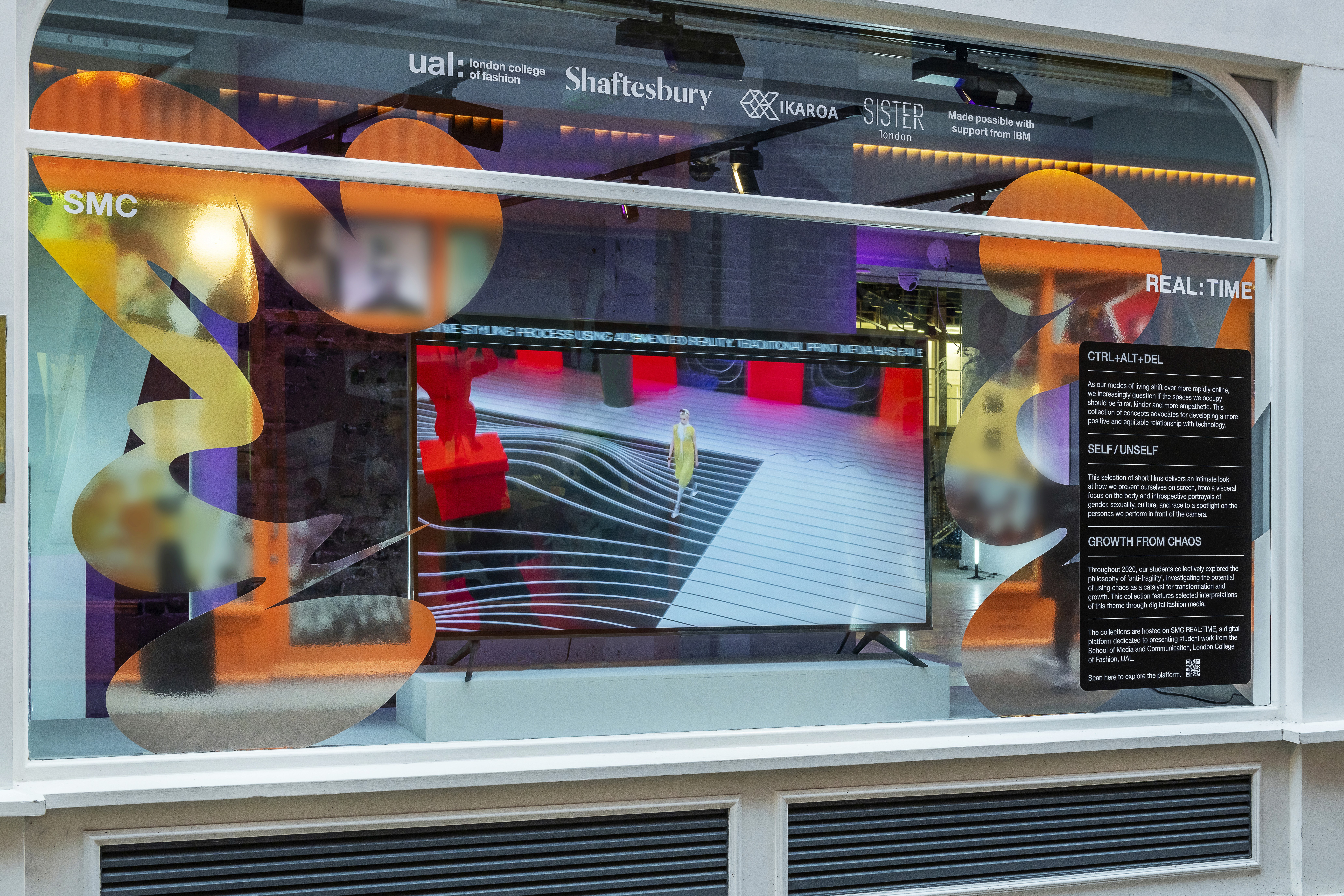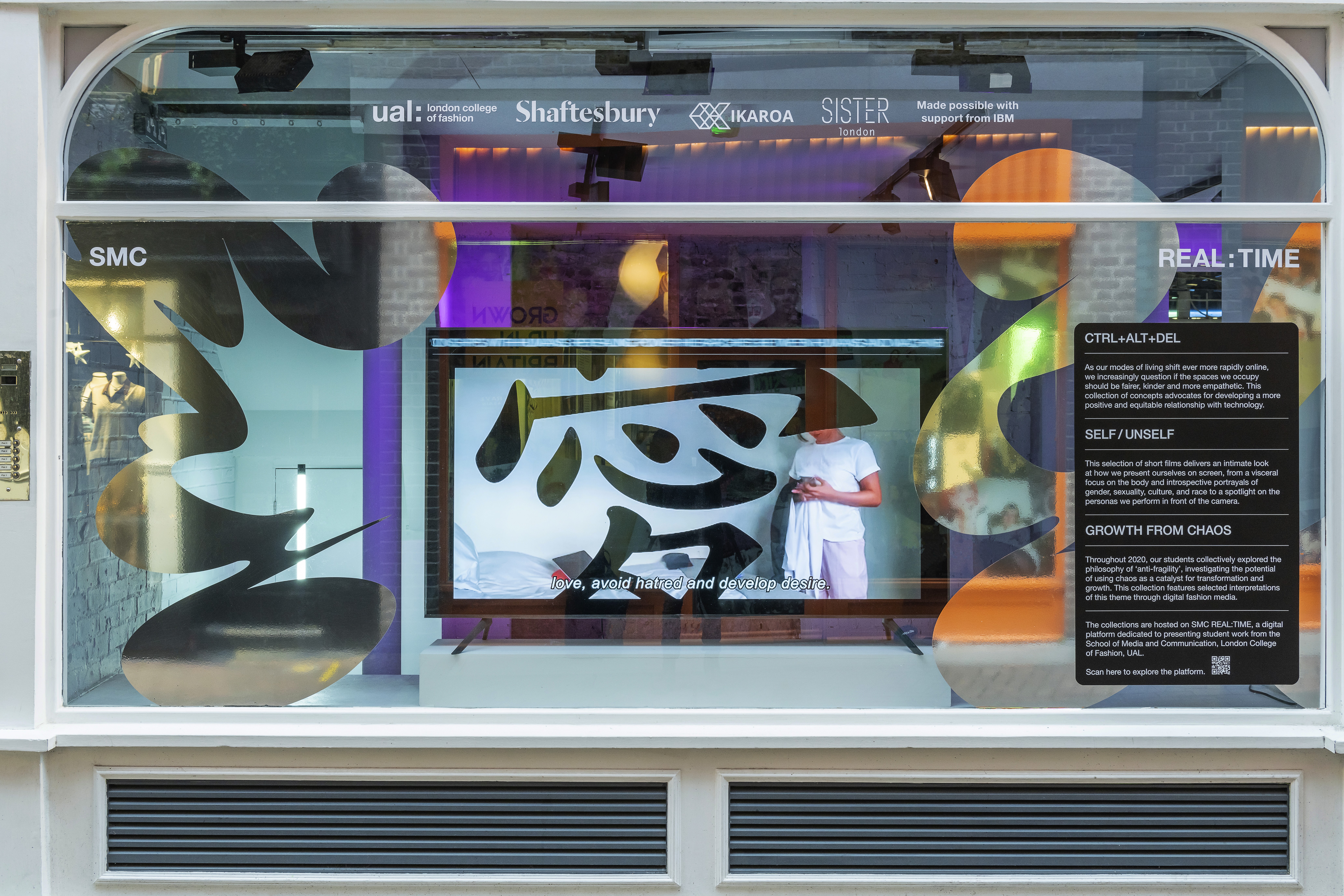 London College of Fashion, UAL, presents work by students and graduates from the School of Media and Communication, exploring the body as a creative site across fashion media, communication, and performance. The exhibition visuals feature Body Experimental Type, a typographic system developed through bodily movement and performative expression. Reintroduced into a three-dimensional context, the type is situated within both spatial and fashion environments. In the window installation, the letterforms are produced in metallic silver vinyl, reinforcing their sculptural quality and reflective dimensionality. The project has been internationally recognised with a Silver Cube at the 100th ADC Awards (New York), a Wood Pencil at the D&AD Awards (UK), and selection as Type Design of the Year at the Tokyo TDC Annual Awards.